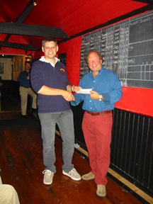 Allen of The Barnstormers presenting a cheque for £6,200 to Bruce Reed from